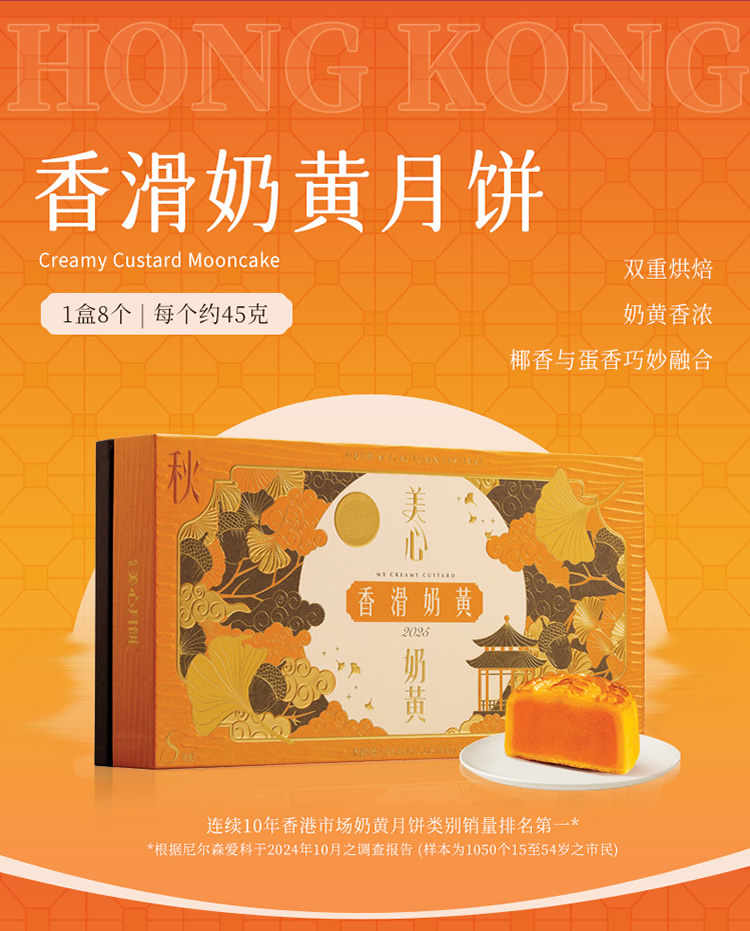 品名:美心香滑奶黄月饼礼盒零售价: 358元(企业团购优惠)保质期:90天口味:香滑奶黄月饼礼盒规格:1盒8个,每个约45克(360g) 包装产地: 香港贮存方法:请存放于阴凉干爽处,如开封后请放于冰箱内冷藏