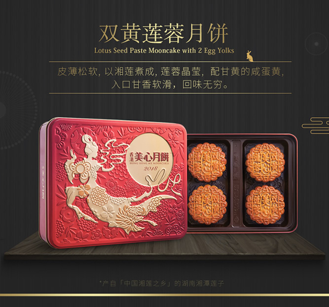 香港美心月饼除了多款传统月饼,年年跟大家团圆外,按照惯例,每年都有新品出炉。口味各个独特。香港美心双黄白莲蓉月饼是即传统又经典的款式毫无疑问,香港美心月饼-皇牌系列由国际品牌及产品包装设计师全新设计,盒面以【意匠文字】手法,将【嫦娥奔月】及香港著名地标图案融入【美心月饼】四字,不但能突出品牌,更突显节日传统及地方特色。