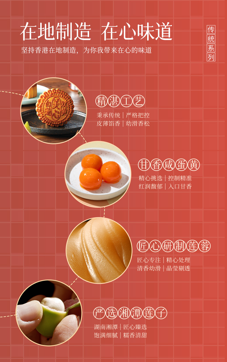 特点:清甜细滑的白莲蓉,配上顶级咸蛋黄,给您难忘的佳节好滋味。