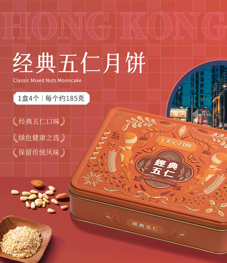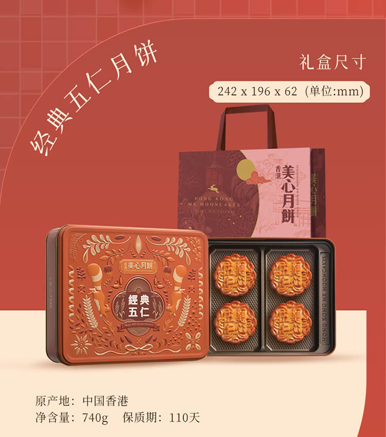 品名:美心五仁月饼礼盒740克零售价: 328元(企业团购优惠)保质期:110天规格:1盒4个,每个约185克(740g)包装产地: 香港贮存方法:请存放于阴凉干爽处,如开封后请放于冰箱内冷藏
